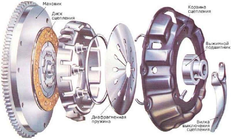 В конструкцию стандартной муфты сцепления, используемой на большинстве авто с МКПП, входят такие основные элементы: