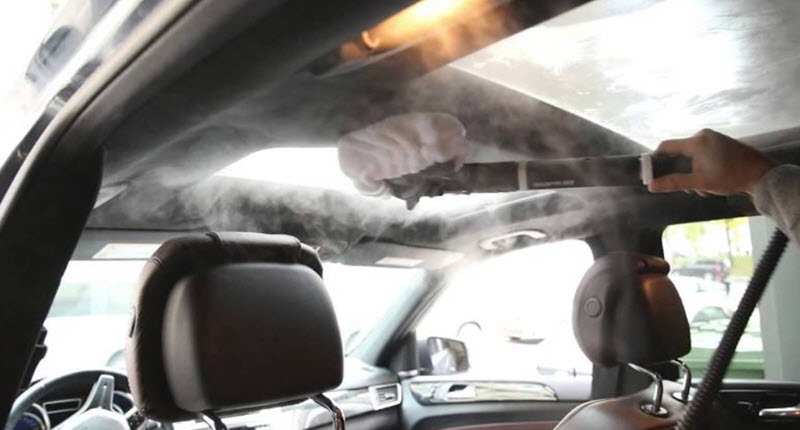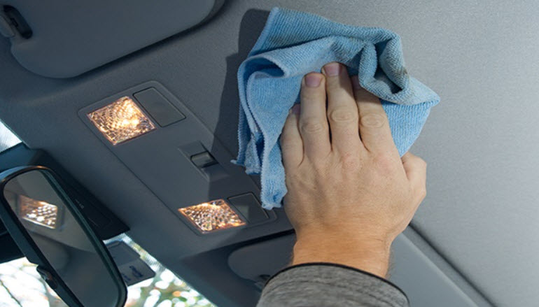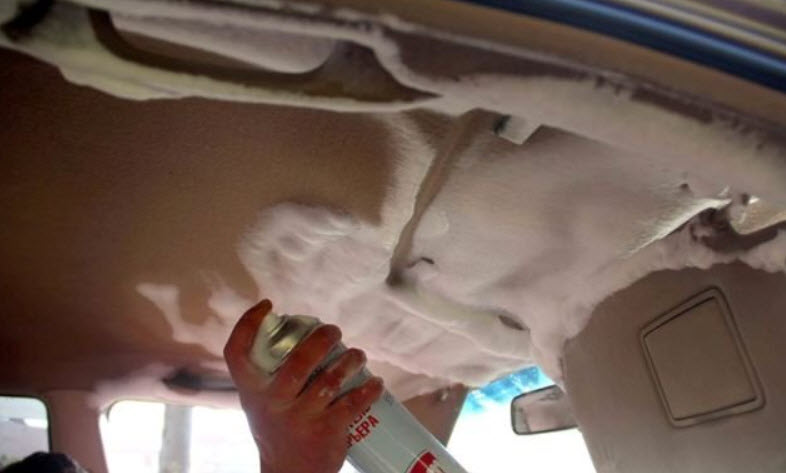 Перед началом работы надо выяснить, из чего сделана обивка потолка. От этого будет зависеть выбор технологии очистки и расходники.