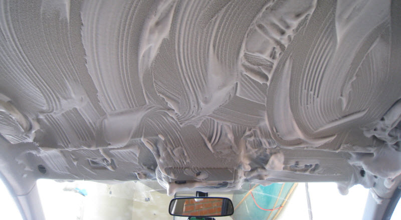 Удаляется отработавшее средство при помощи влажных поролоновых губок. Процедура повторяется несколько раз, пока губки не перестанут загрязняться от работы по потолку. Это будет означать, что остатки средства полностью удалены, и потолок чист. Действовать надо в одном направлении, от переднего стекла к заднему.
