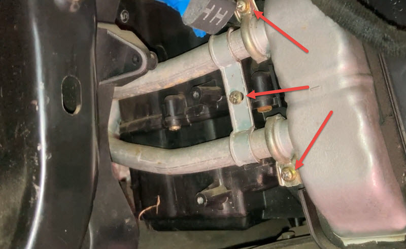 - После этого надо открутить два хомута и фиксирующую планку между подходящими патрубками.