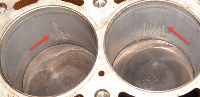 Пострадать может как поршень, так и стенка цилиндра, часто именуемая зеркалом, хотя на самом деле поверхность там совсем не зеркальная, а содержит мелкую сетку искусственно нанесённых царапин.