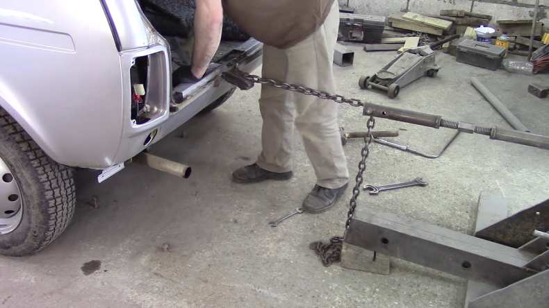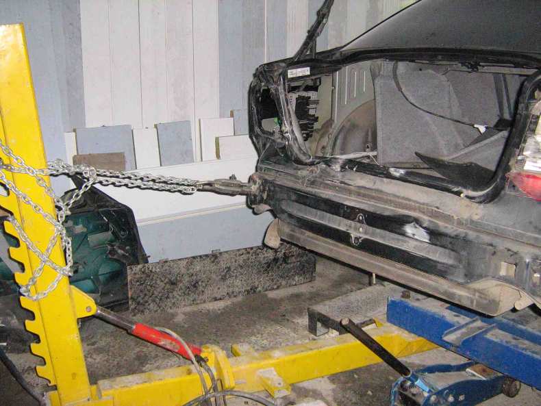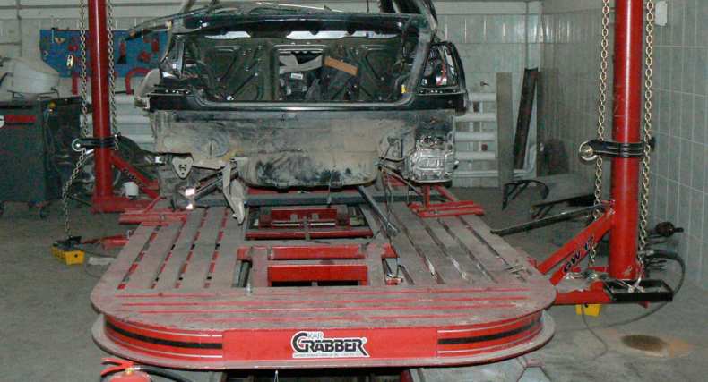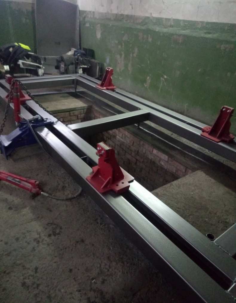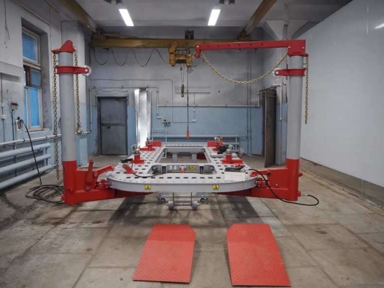 - Далее специалисты прибегают к использованию связанных с рихтовочным стендом цепям, захватам, приборам для измерения. Мастера определяют точный участок машины, на котором будут производиться ремонтные работы.