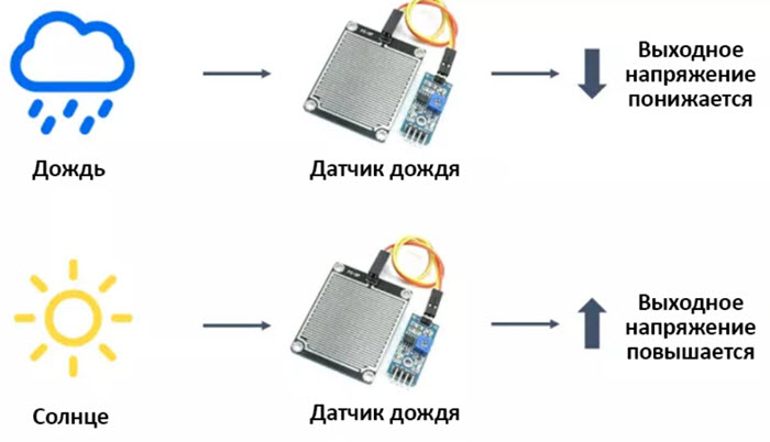 Когда в зоне слежения датчика появляется капля воды, даже самых небольших размеров, на границе раздела сред стекла и атмосферы изменяются условия преломления. Уже невозможно вернуть в тело стекла всю энергию луча, часть её уйдёт в воду. Сигнал на выходе приёмника моментально на это отреагирует, он уменьшится.
