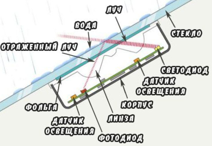 При сухом стекле угол размещения светодиодов и фотоприёмников с оптикой подобран таким образом, что наблюдается полное внутреннее отражение лучей от наружной поверхности лобового стекла. Точно так же, как в упомянутых выше волоконно-оптических линиях. К фотодиоду поступает максимальное количество энергии.