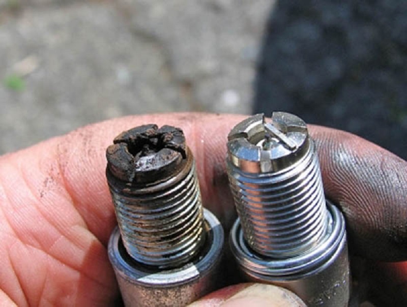 - Если высоковольтные провода или свечи зажигания не функционируют должным образом, то воспламенение смеси может нарушиться. В итоге топливный заряд в цилиндре может поджигаться несвоевременно, обороты не растут, мощность мотора падает. Такие последствия влечет загрязнение либо замасливание свечей (особенно на моторах с существенным пробегом), некорректно выставленные зазоры на электродах, повреждения корпуса свечи.