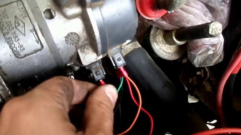 Клемму со знаком «+» устанавливают на шпильку «Б», без обозначения – на «К». Чёрная клемма относится к массе и прикрепляется в районе коммутатора.