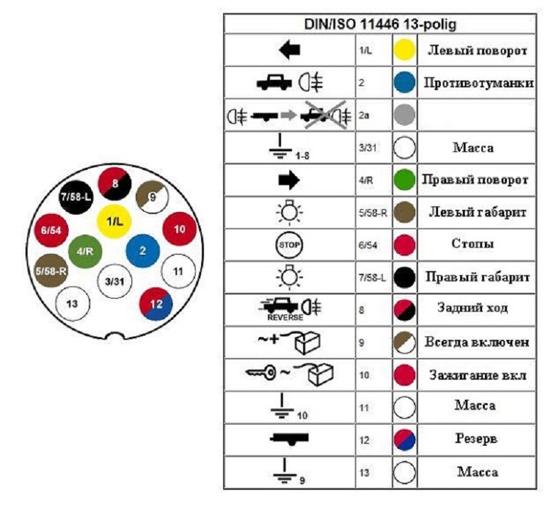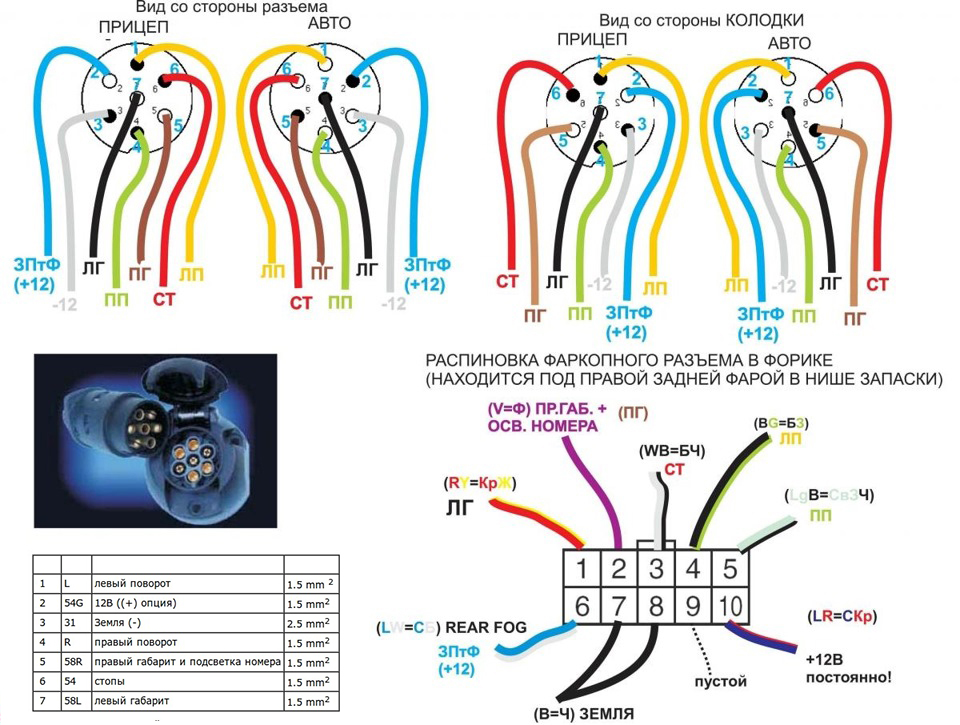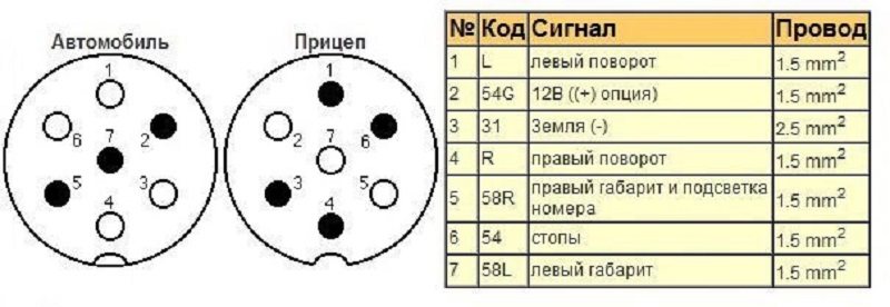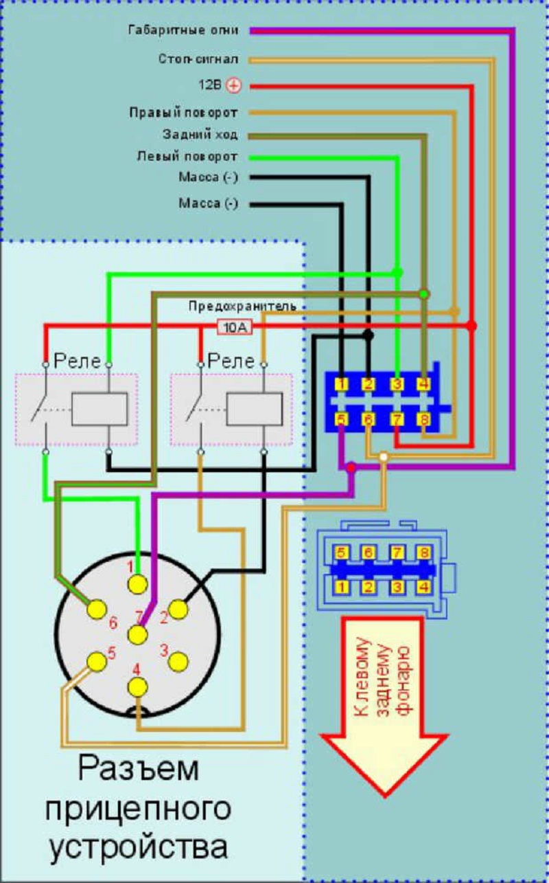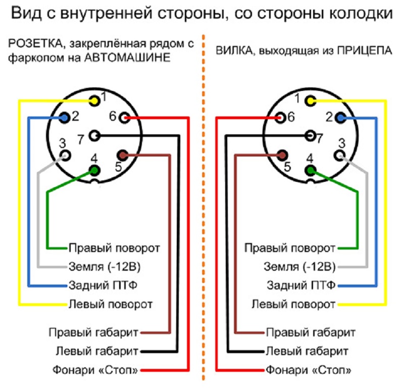 Схема подсоединения прицепа российской 7-контактной розетки выполнена таким образом: