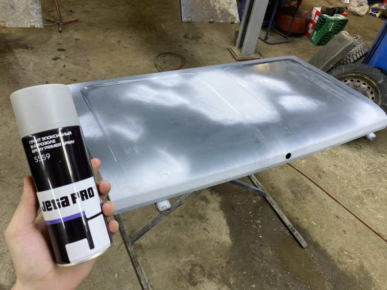 Как только нанесли эпоксидный грунт поверхность покрывается однородной пленкой, исключающей оконтуривание, она дает усадку и может быть хорошей основой для акрилового. Также можно устранить влагу на ремонтируемых панелях любого этапа ремонта, например, если машину нужно выкатить на улицу на какое-то время.