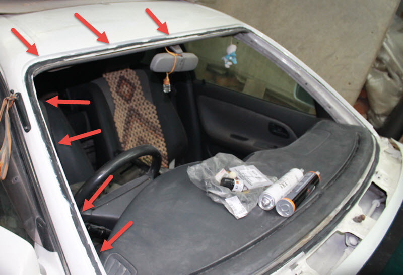 Как лобовые стёкла старого образца, с резиновым уплотнением, так и современные вклеенные могут пропускать воду по стыку с рамкой оконного проёма. Особенно после ремонтной замены стёкол. Приходится проливать уплотнения снаружи, определять места утечек и использовать герметики.