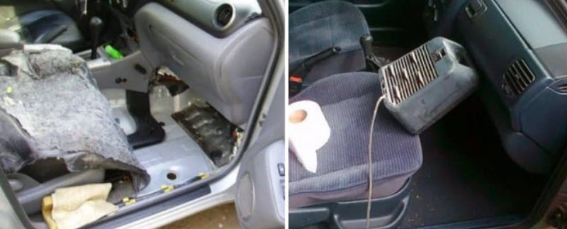 Внешние мощные обогреватели сработают гораздо лучше, чем штатный отопитель. Высушенный салон проветривается прохладным сухим воздухом. Эффект при тщательном выполнении тот же, что и при сушке салона на летнем солнце.