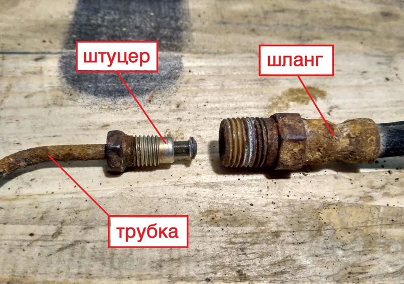 Кроме закисания резьбы, случается и прикипание тормозной трубки к накидной гайке. Если трубка подлежит замене, то это никакой роли не играет, но при попытке сохранить родную деталь начинаются затруднения. Даже при начавшей вращаться гайке прокручивание трубки вместе с ней не позволяет сделать и одного полного оборота.