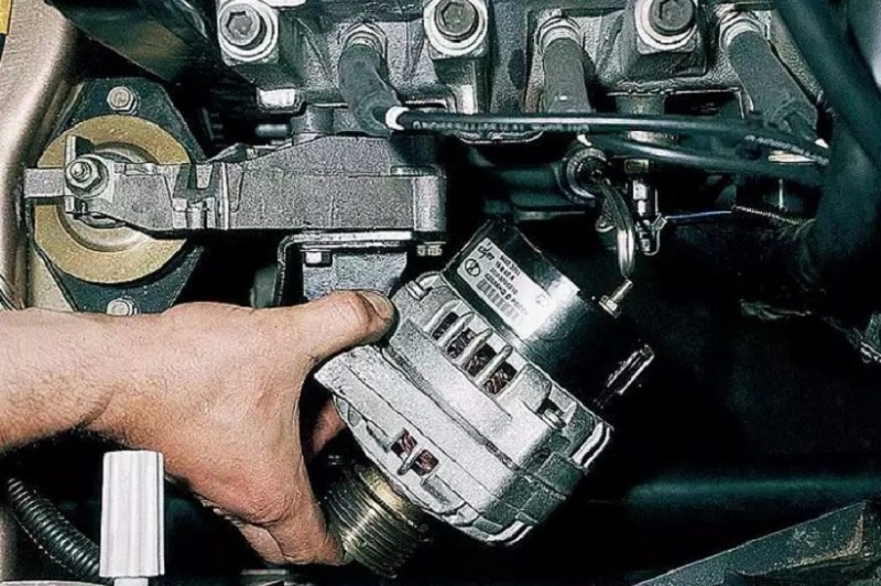 - Снимите аккумулятор, в противном случае он не позволит добраться до гайки, удерживающей генератор.