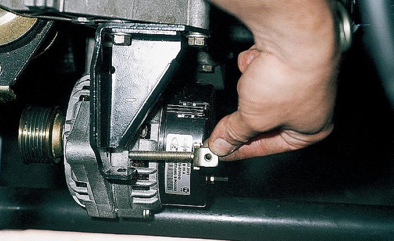 - Откручиваем на генераторе крепежную гайку, а затем нужно ослабить регулировочный болт.