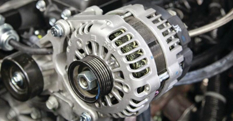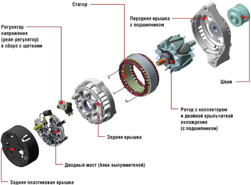 - генератор переменного тока, обычно это трёхфазная динамомашина со встроенным выпрямителем, реле-регулятором, обмотками возбуждения в роторе и силовыми на статоре;