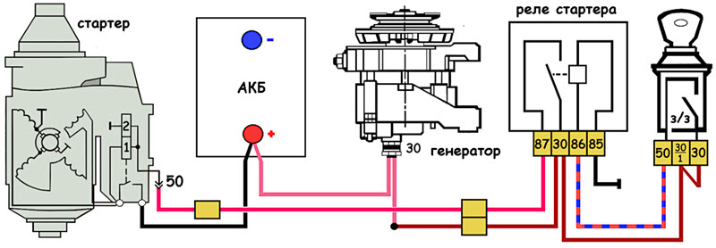 - силовая и управляющая проводки, блоки реле и предохранителей, контрольная лампа и вольтметр, иногда амперметр.