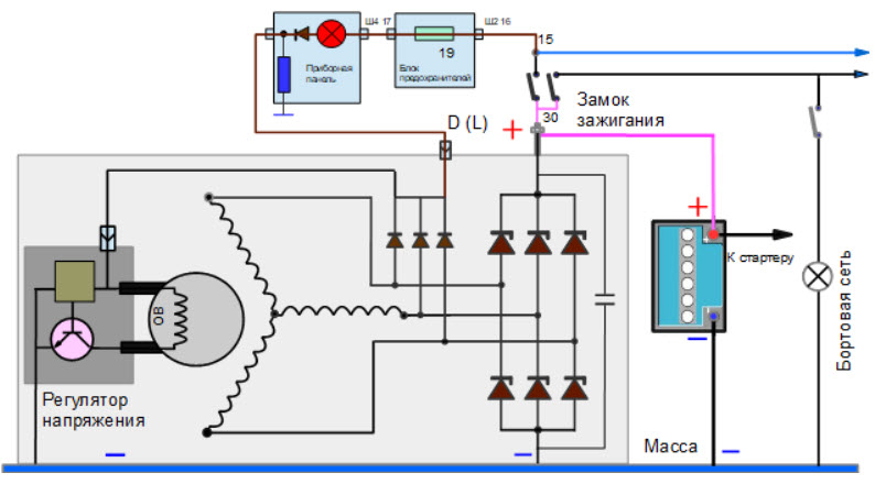 Генератор и АКБ подключены к силовой питающей цепи. Регулирование заряда осуществляется стабилизацией напряжения в сети на уровне 14-14,5 Вольта, что обеспечивает подзаряд батареи почти до максимума с последующим прекращением зарядного тока из-за роста внутренней ЭДС АКБ по мере накопления энергии.