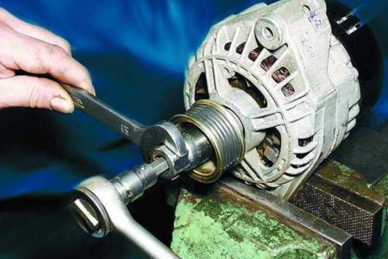 Сложности могут возникнуть лишь с отворачиванием гайки шкива. Потребуется ударный гайковерт или большие тиски с мягкими прокладками. Стопорить ротор при работе с гайкой можно только за шкив, остальные детали будут деформироваться.
