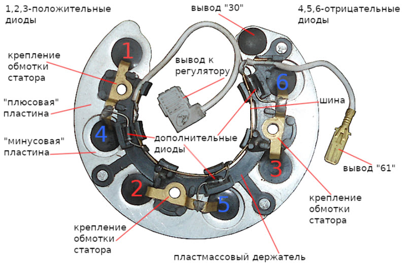 Обычно в состав моста входят три пары кремниевых диодов плюс три дополнительных маломощных на питание регулятора, по ним же идёт замер выдаваемого напряжения для оперативного регулирования тока возбуждения.