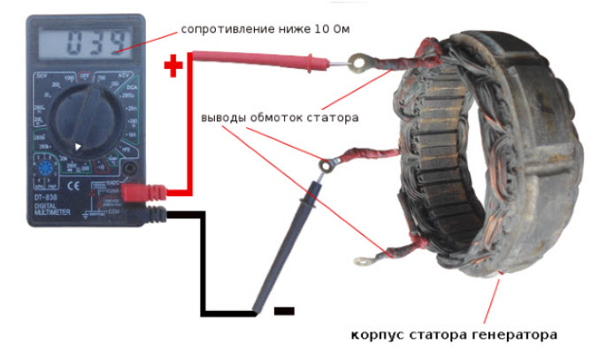 Аналогично прозваниваются обмотки статора, здесь сопротивление ещё ниже. Поэтому можно убедиться только в отсутствии обрывов и замыканий на корпус, часто этого достаточно, но не всегда.