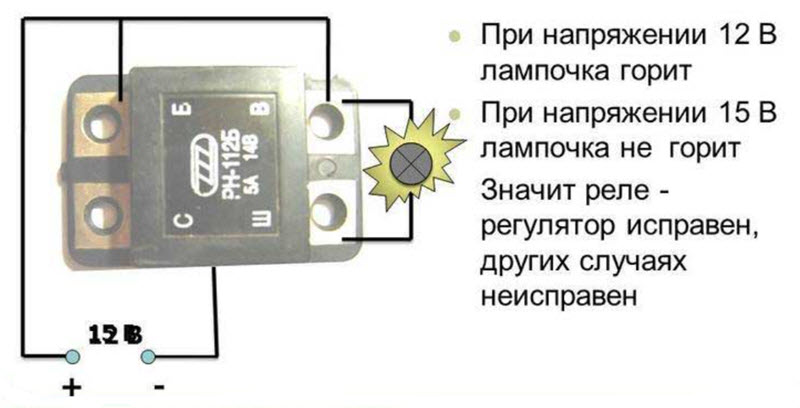 Подключённая к щёткам лампа должна загораться при падении питающего напряжения на микросхеме регулятора ниже 14 Вольт и гаснуть с превышением, то есть коммутировать обмотку возбуждения при переходе порогового значения.
