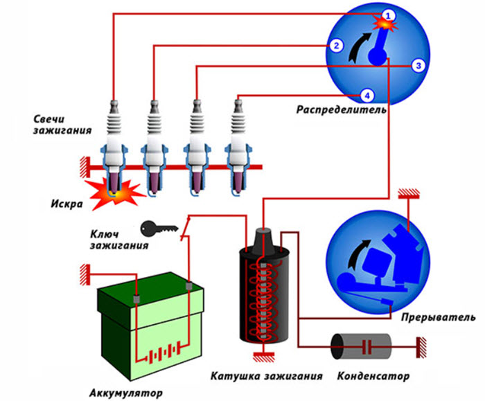 - преобразование энергии тока, направляемого в неё через бесконтактный или на старых моторах механический ключ (контактную пару), управляемый непосредственно датчиком или через электронный контроллер двигателя (ЭБУ);