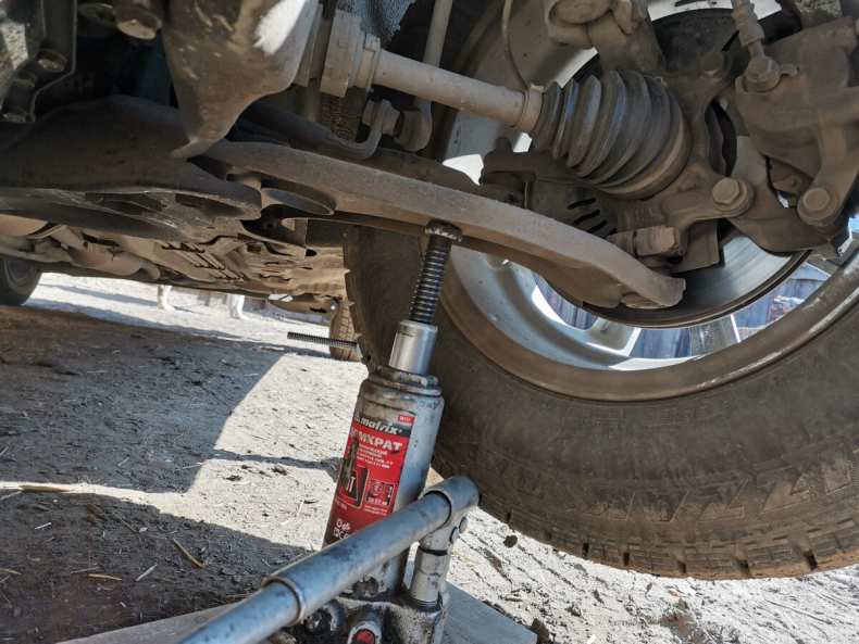 - Используя подъёмник либо домкрат, авто поднимается и подкладывается под корпус опоры подготовленный ранее упор. Оптимально применить регулирующуюся по высоте треногу. Затем автотранспорт постепенно опускается вниз, надавливая на шариковую опору. Колесо здесь оказывается в воздухе и способно без помех крутиться.