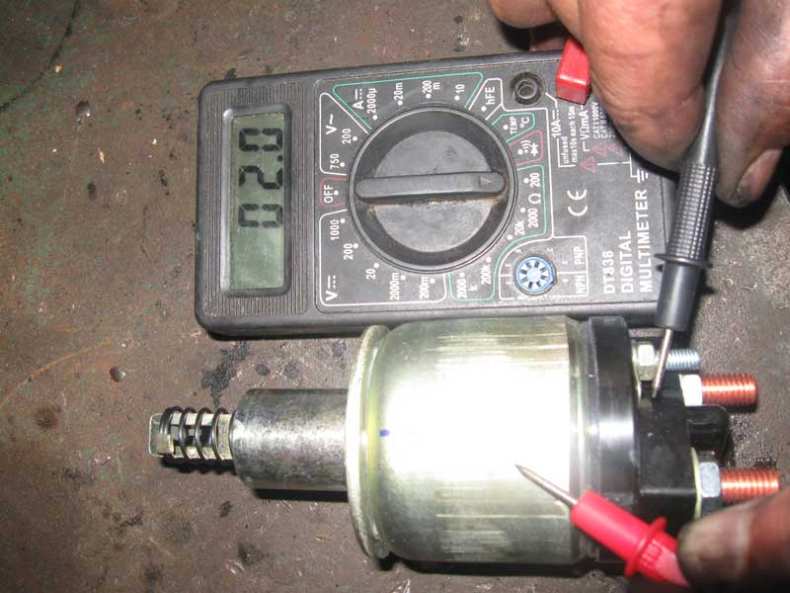 - Дребезжащий или повторяющийся щелчок. Это может произойти из-за плохого контакта или замыкания витков обмоток. Чтобы убедиться в этом снова понадобится тестер для измерения сопротивления. Согласно принципиальной схеме начало обеих катушек соединено с управляющим входом, конец удерживающей выведен на массу, а втягивающей — на выход пускового реле.