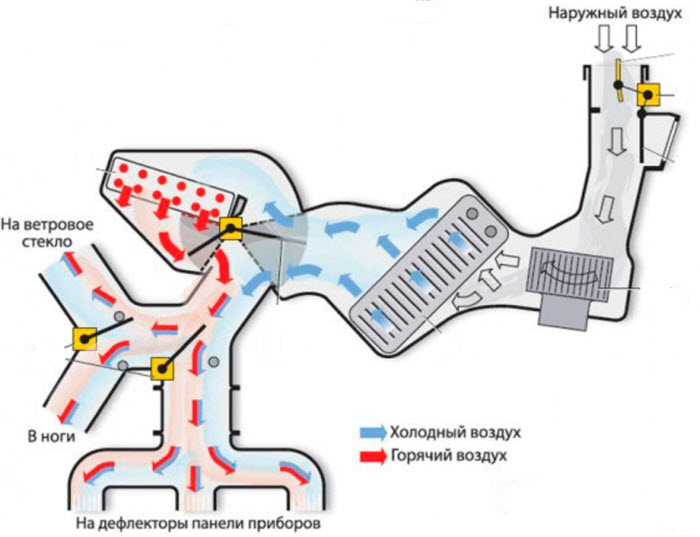 Воздух может забираться снаружи или изнутри салона (рециркуляция). Последний режим полезен при экстремальных внешних температурах или сильном загрязнении за бортом.