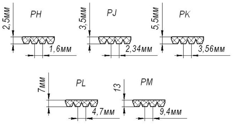 Подавляющее количество ремней в легковых автомобилях имеют общую толщину плоского поликлина 5,5 мм, что кодируется буквами PK. Шаг при этом составляет 3,56 мм.