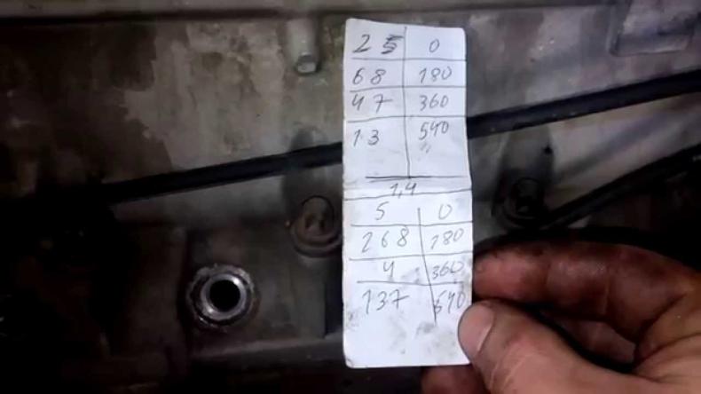 - Повернув звездочку на 90 градусов, коленвал повернется на 180 градусов. Метка окажется напротив линии соединения верхней и нижней постели распредвала. Теперь нужно выставлять зазоры в 4 и 7 цилиндрах.