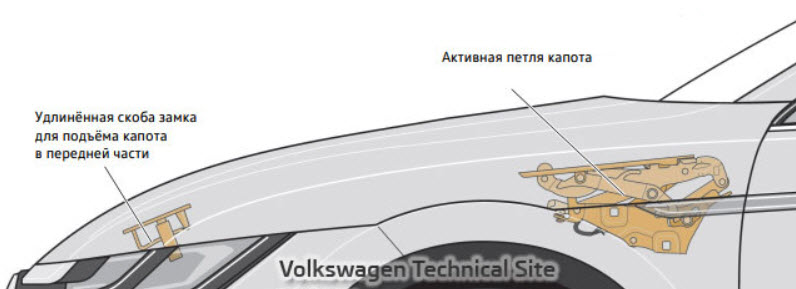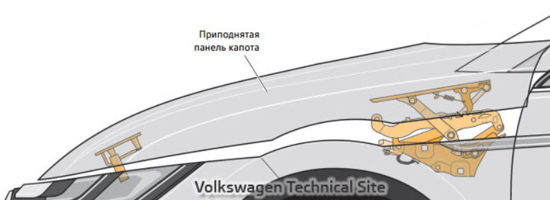 - механизмы и узлы, перемещающие капот в положение минимального вреда;