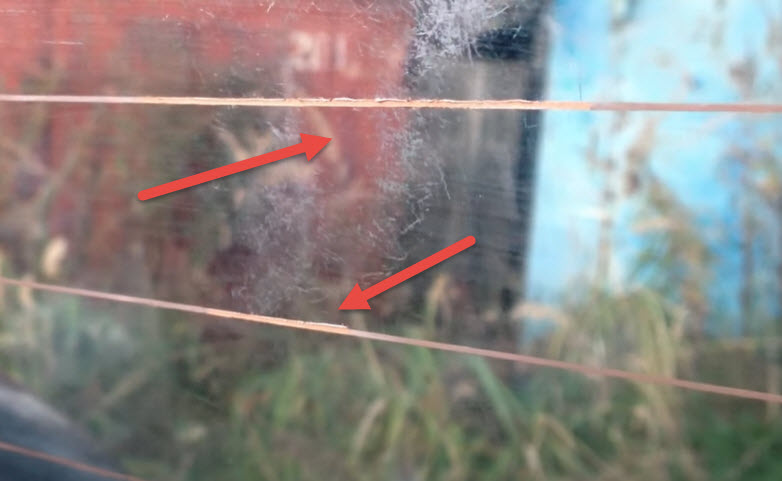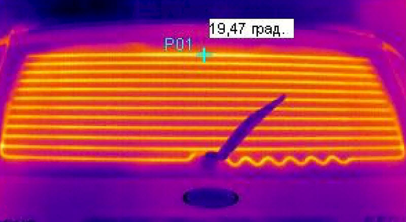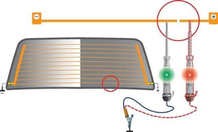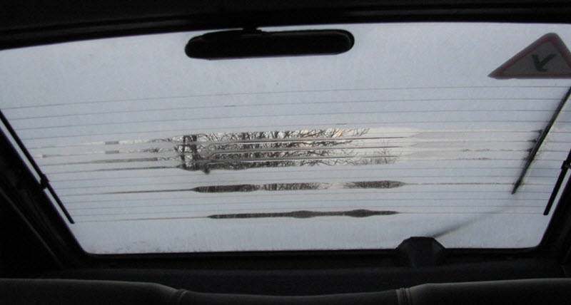 Первичную локализацию неисправности сразу видно при включении обогрева на запотевшем стекле. Целые нити быстро образуют вокруг себя прозрачные участки стекла, а вокруг оборванной конденсат долго сохраняется.