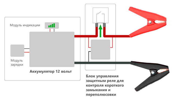 - Выходные силовые разъёмы или провода для подключения к разряженному аккумулятору машины;