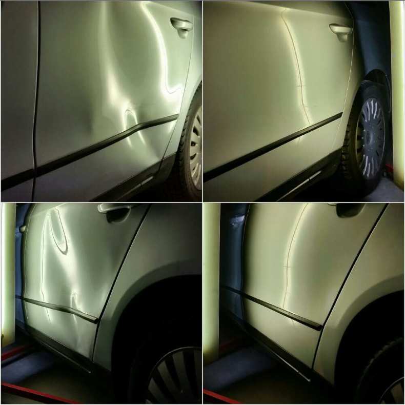 - При появлении вмятины на поверхности кузова происходит углубление металла, поднятие краёв вокруг зоны. Если кузов имеет выпуклую поверхность, увидеть место работы можно будет с большой долей вероятности. Похоже явление на вулканическую конструкцию небольшого размера. Чтобы справиться с проблемной ситуацией, при выправлении вмятин простукивают по возвышающимся местам рядом с ними. Если есть плавные вмятины, нужно легко простукать с помощью руки. В этом случае должны полностью отсутствовать складки, краска не нарушена.