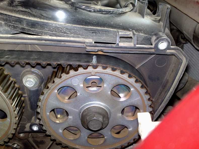 После выставления ВМТ (верхняя мёртвая точка), необходимо установить новый ремень и затянуть натяжитель. Затем нужно проверить, не сместились ли метки в процессе установки новой детали. Для этого достаточно несколько раз прокрутить коленчатый вал, и проверить положение меток. Если нужно, следует отрегулировать узел.