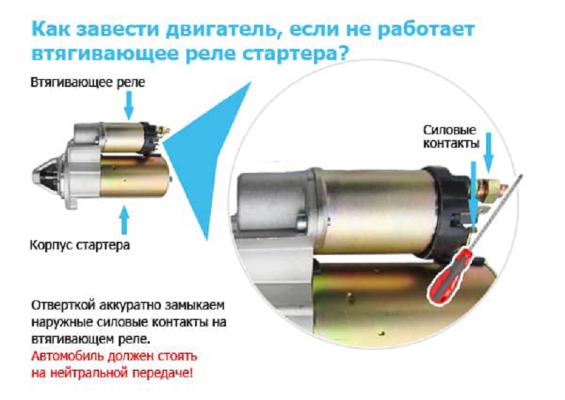 Замыкать стартер отверткой можно лишь в случае, если причиной поломки является втягивающее реле. Узнать о такой поломке можно по характерному щелканью из подкапотного пространства, когда водитель проворачивает ключ. Это означает, что втягивающее реле включается, однако ведущая шестерня не проворачивает коленчатый вал. Единственный выход в таком случае — перемкнуть стартер с помощи отвертки и дать таким образом напряжение на обмотки.