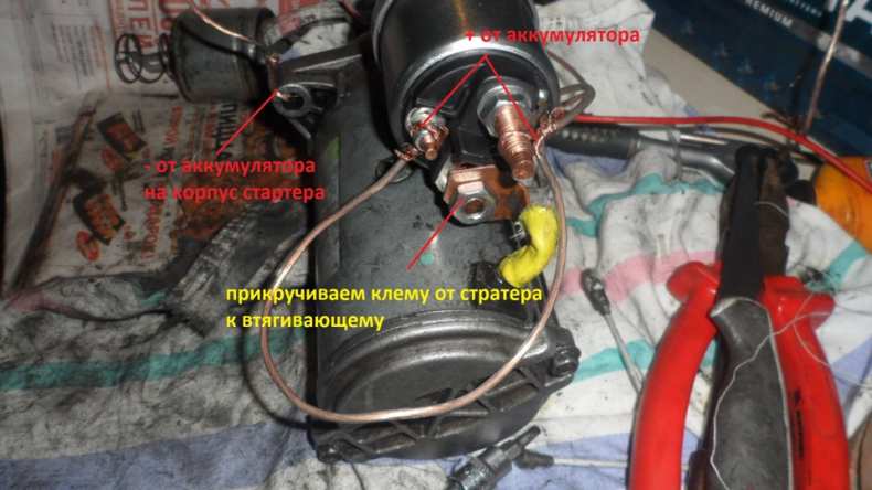 - замкнуть пускатель непосредственно на аккумуляторную батарею.