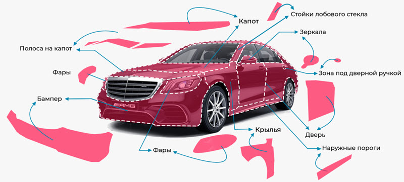 Логичнее всего оклеивать наиболее рискованные при обстреле гравием зоны кузова. Это бампер, крылья, двери, крышки багажника и капота.