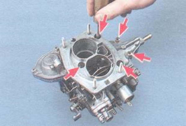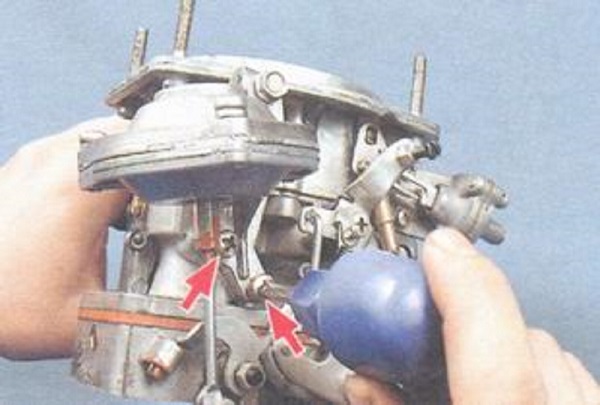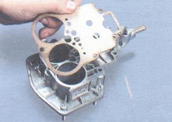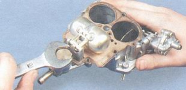 В большинстве случаев не требуется дальнейшая разборка карбюратора, поскольку его удается тщательно промыть и с не разобранным корпусом дроссельных заслонок. Элементы рычажного механизма, оси дроссельных заслонок и сами заслонки при потребности можно демонтировать и на не разобранном карбюраторе. Потребность отсоединить корпус дроссельных заслонок появляется, как правило, чтобы заменить поврежденную теплоизоляционную прокладку либо сам корпус в сборе.