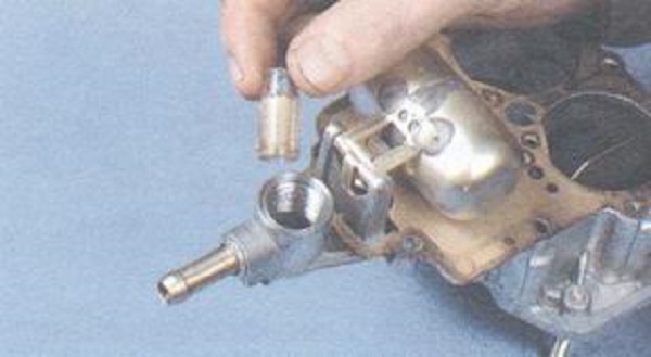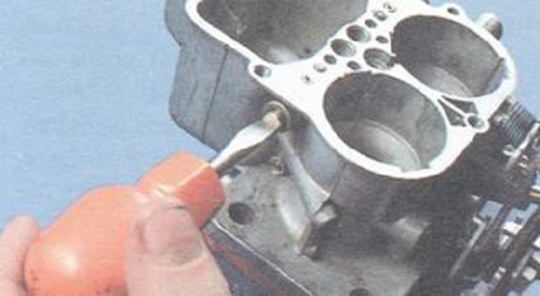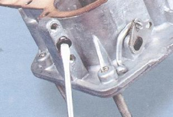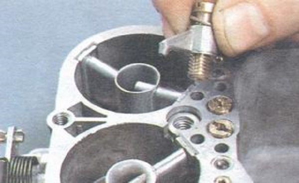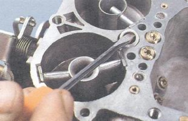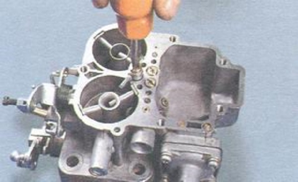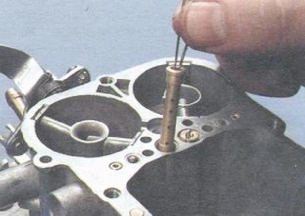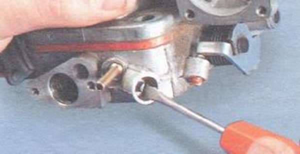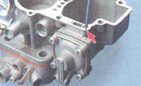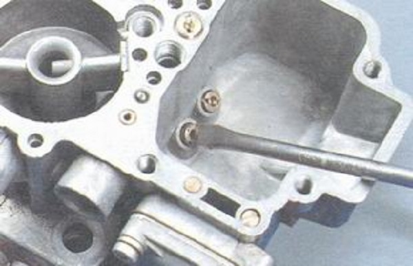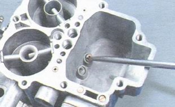 - Выворачиваем корпус топливного жиклера переходной системы 2-ой камеры и снимаем его с жиклером. При потребности вынимаем из корпуса жиклер так же, как делали это для топливного жиклера ХХ.