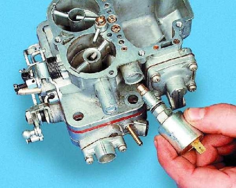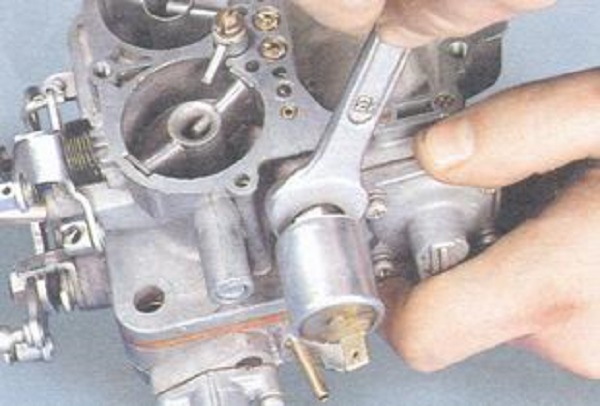- Ослабляем затяжку электромагнитного клапана ХХ и выворачиваем из корпуса карбюратора клапан с топливным жиклером.
