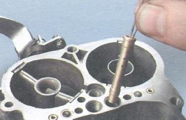 - Поддев отверткой, вынимаем из гнезда карбюраторной крышки уплотнительное кольцо пускового устройства.