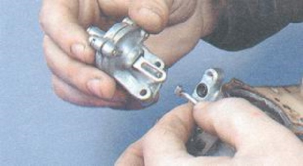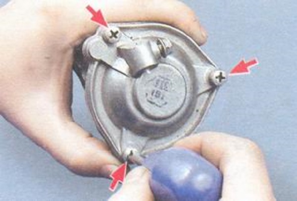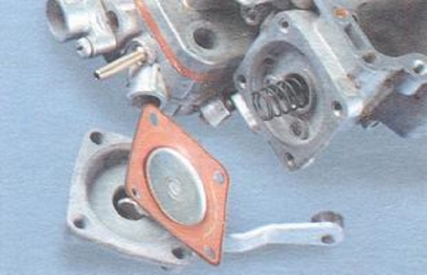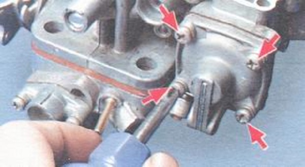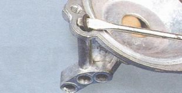 - Отворачиваем два винта, крепящих корпус пневмопривода к карбюратору, и снимаем пневмопривод с прокладкой.