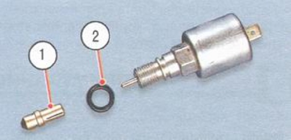 - Из корпуса электромагнитного клапана вынимаем топливный жиклер ХХ (1) и снимаем уплотнительное кольцо (2). Вынуть топливный жиклер можно пассатижами, обернув полоской бумаги поясок жиклера.