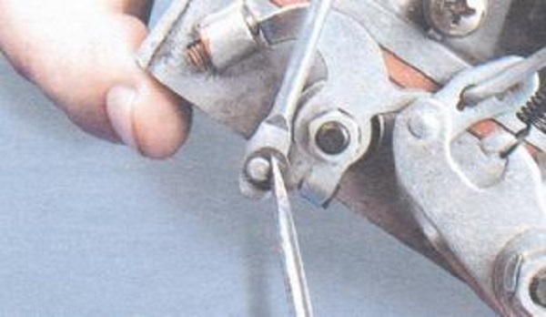 - Чтобы снять ось воздушной заслонки, выворачиваем два крепежных винта заслонки, надфилем опилив их раскерненные концы. Далее вынимаем заслонку из прорези оси, пометив ее положение, чтобы в дальнейшем правильно установить ее. Теперь ось можно легко вынуть из крышки карбюратора.