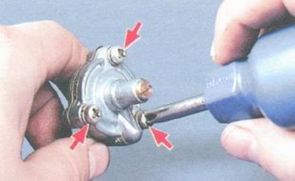 - Отворачиваем четыре крепежных винта крышки ускорительного насоса.