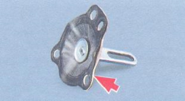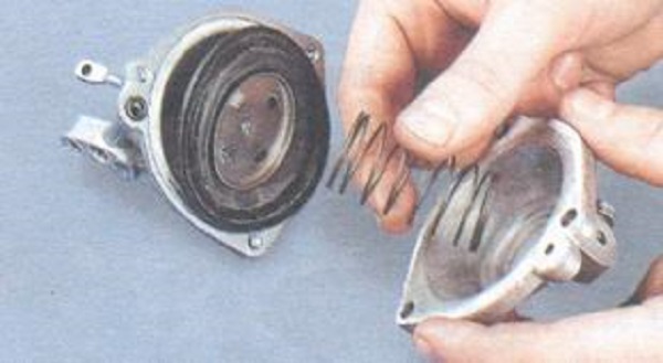 - Отсоединяем от крышки пусковое устройство. Далее, развернув устройство на 90 градусов, отсоединяем его от тяги, выведя из паза штока диафрагмы ее конец.