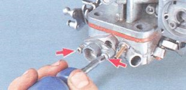 - Выворачиваем регулировочный винт подачи ускорительного насоса.