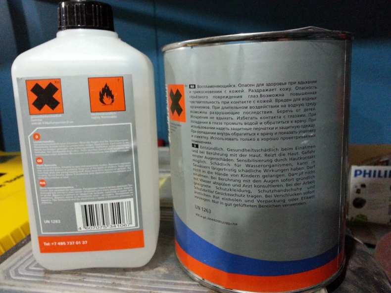 - Бикомпонентные средства. Эти препараты перед применением необходимо подготовить. Для этого к основному веществу добавляется активатор, который бывает жидким либо твердым. Специалисты рекомендуют к использованию именно твердый вариант потому, что такое средство способствует созданию более равномерной пленки по всей поверхности кузова.