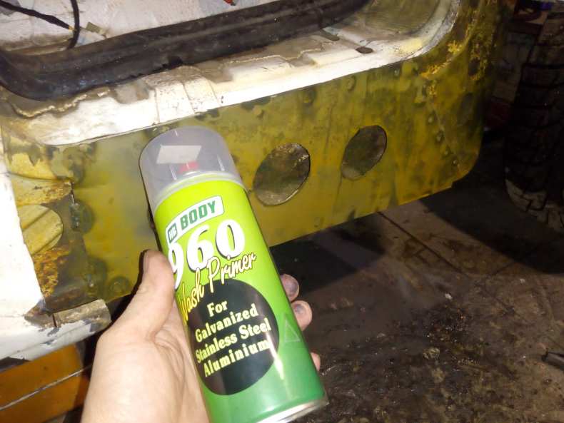 - Третьим шагом производится нанесение кислотного грунта. В малодоступных местах или на сварных швах лучше использовать кисточку. Для остальной поверхности более уместным будет аэрозоль. При нанесении грунтовки нет необходимости в обилии грунтовки, достаточным будет тонкий равномерный слой.